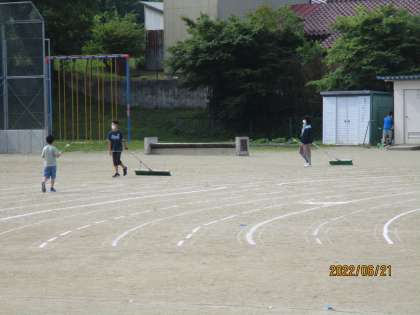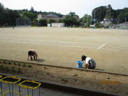 毎朝、美化委員会と運動委員会の児童が校庭で草むしりをしたり、ブラシをかけたりとそれぞれの委員会の活動をしています。