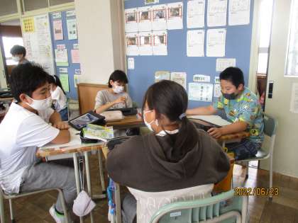 子どもたちは、3〜4名のグループに分かれ、タブレットを用いながら提案内容を何にするか考えていました。