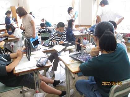 タブレットに入っているソフトの中のシンキングツールという道具を使って、話し合ったことをまとめました。子どもたちはグループで画面を共有しながら、話し合ったことをまとめていました。