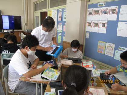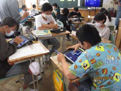 子どもたちは、慣れた手つきでタブレットを操作し、話し合ったことをタブレットに書き込んでいました。