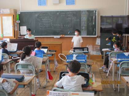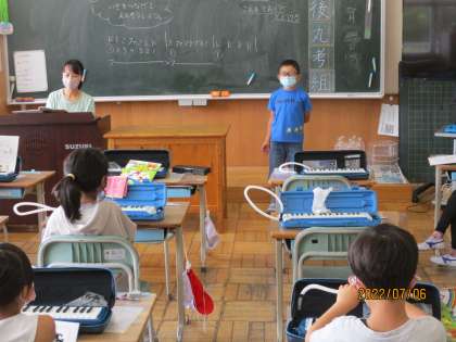 「一人で歌える人」という先生の問いかけに子どもたちは手を挙げ、一人ずつ歌いました。先生の伴奏に合わせて上手に歌っていました。