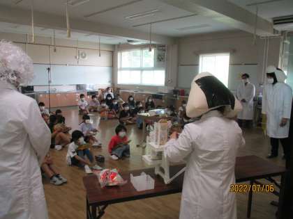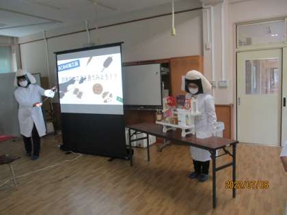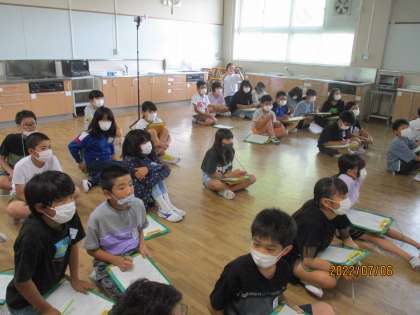 田んぼには、米を育てるだけでなく、洪水や土砂崩れを防止したり、生き物のすみかになったりと、いろいろな役割があるそうです。また、福島のお米「福、笑い」と「コシヒカリ」、「タイ米」の3種類のお米の食べ比べを行いました。それぞれの違いや良さを感じながらいただくことができました。子どもたちにとって身近なお米についてのお話だったので、興味深く聞くことができ、たくさんの質問をして学習することができました。
