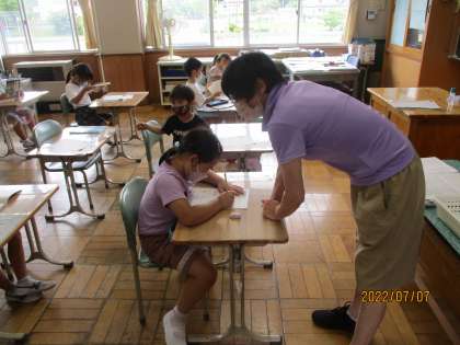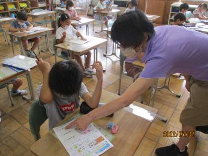 8時10分からの高瀬タイム(朝の学習)の時間に1年2組では、算数のプリント学習を進めていました。先生に説明してもらいながら、一生懸命取り組む子どもたちの姿が見られました。
