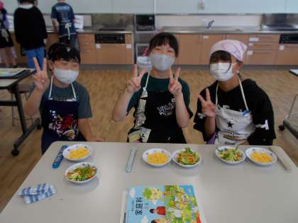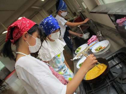 今回作ったのは野菜炒めとスクランブルエッグです。グループで協力して野菜を切ったり炒めたりする作業を進め、計画通りに作ることができました。
