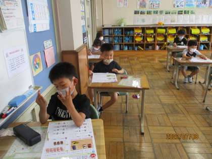 1年2組では、算数の時間に引き算のテストを行いました。