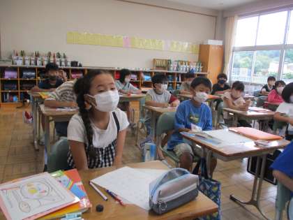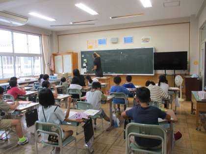 AETの先生が書き順を教えていました。子どもたちは、教えてもらった書き順でアルファベットを書いていました。
