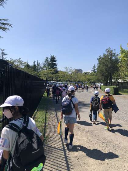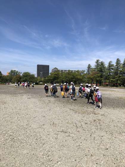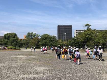 みんなで開成山公園の開拓者の群像の所へ移動しています。