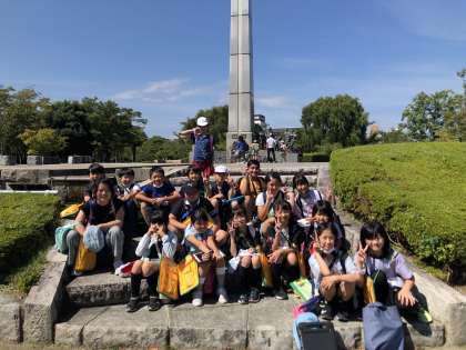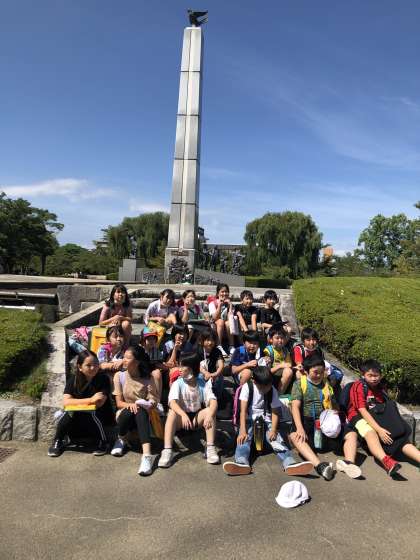 開拓者の群像の前で記念撮影