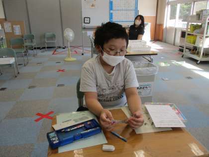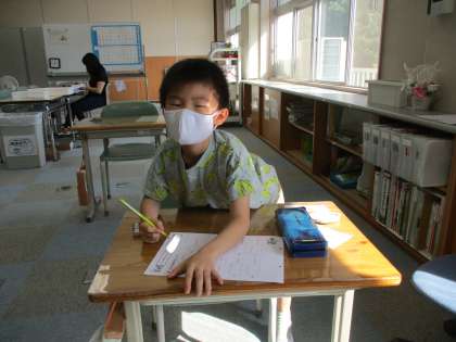 あおぞら学級では、1年生と5年生が帰った後に2人の児童が課題に取り組んでいました。宿泊学習で行ったことや漢字プリントに一生懸命取り組んでいました。