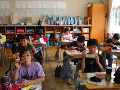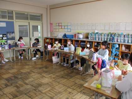 今日はお弁当の日。とてもおいしそうにお弁当を食べていました。写真のようにいつもと机の配置を変えて食べようとしているクラスもありました。おいしいお弁当、ごちそうさまでした。