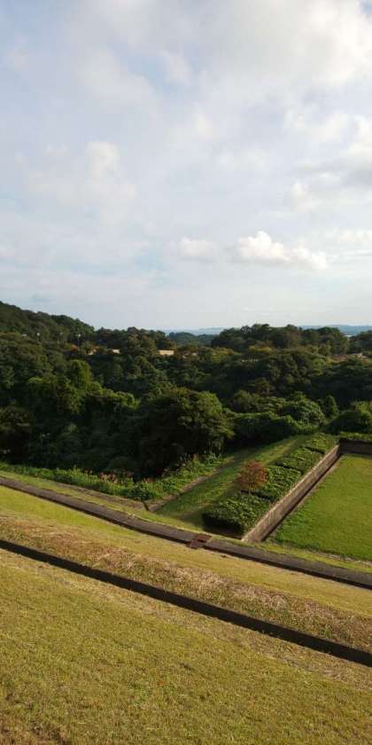 遠くに海が見えます。子どもたちは、自然を満喫しています。