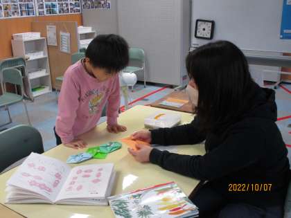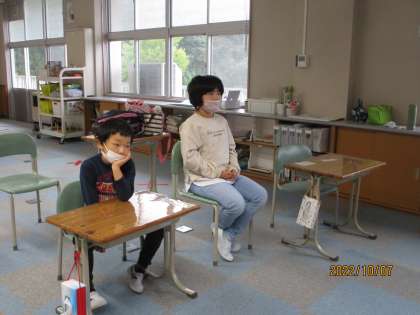あおぞら学級では、昔話のビデオを見ました。子どもたちは、真剣な表情で昔話を見ました。また、他の児童は、折り紙を先生と一緒に行い、四角形のボックスを作りました。