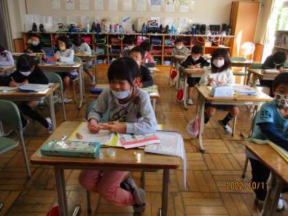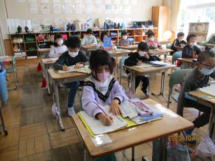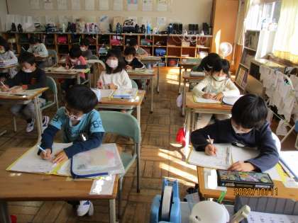 2年1組では、次の日の準備物について、記入用紙に丁寧に書いていました。