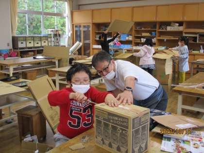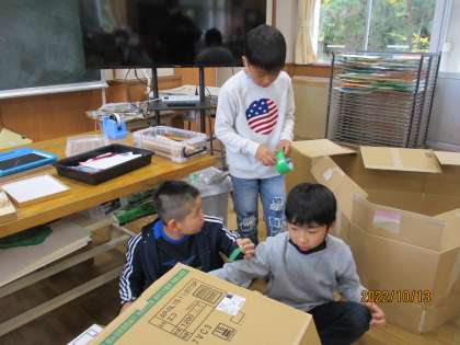 子どもたちは、グループになって、友達と協力しながら、作りたいものを楽しく作っていました。