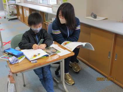 あおぞら学級では、道徳科を行っていました。2年生が先生と一緒に道徳の教科書を読んでいました。