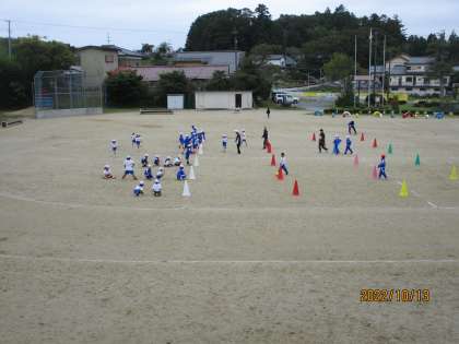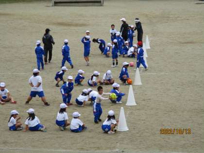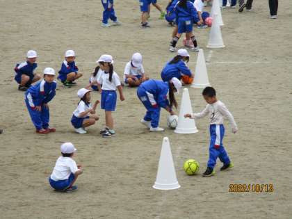 1年生は、体育の時間にボールをけりながら、カラーコーンのところを回ってくるゲームをしました。