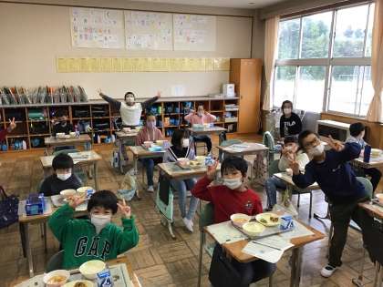 給食の時間には、「すがたをかえる大豆」に登場した豆腐や味噌などが実際に使われていることに気づき、発見に喜んでいる様子でした。