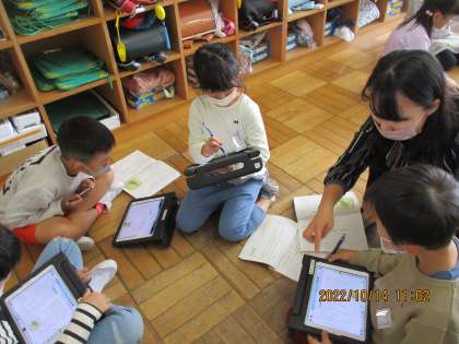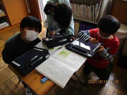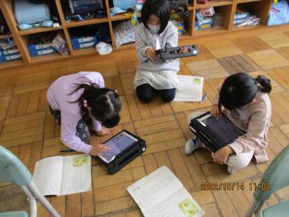 2年1組では、国語の時間に「お手紙」という単元の音読発表をする準備をグループごとにしました。子どもたちは車座になり、「誰がどこを読むか」とか「どういうふうに工夫して読むか」などを話し合っていました。