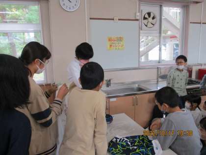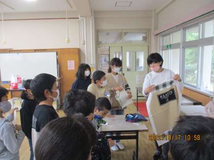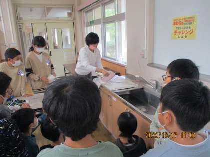 先生の周りに子どもたちが集まり、布の3つ折りのすることやアイロンは使い方を誤るとやけどするので、十分に気を付けて使うようにとの注意点を聞きました。