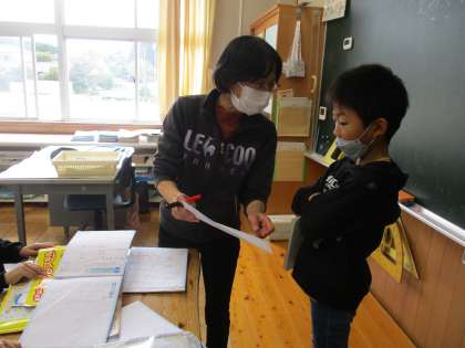 1年2組では、プリント学習を行い、答えがあたっているかどうかを先生に確認してもらっていました。