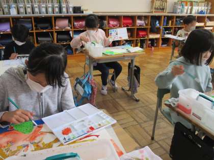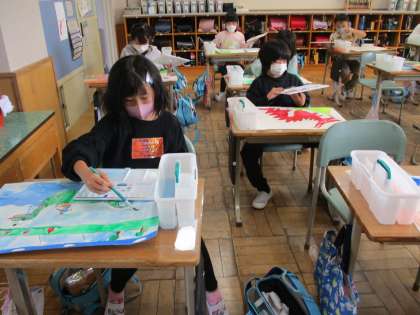 3年1組では、図画工作の時間に「竜の目の涙」と「泣いた赤鬼」の描きたい方の絵を描いて、絵の具で色を染めていました。