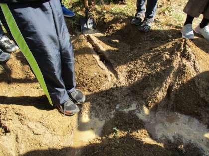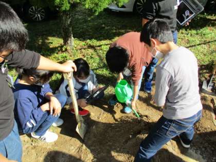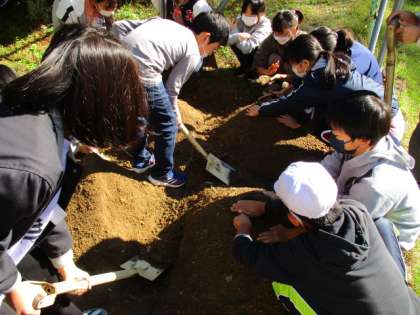秋晴れの下、畑に向かい、山を作って水を流し、観察しました。また観察した様子をロイロノートで撮影しました。