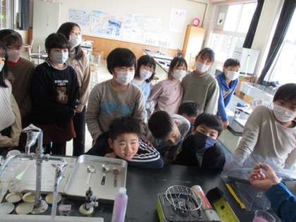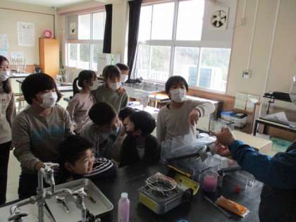 理科室では、4年生が実験を行っていました。線香に火をつけ、その空気の流れを確認してしていました。先生の演示をとても興味深そうな表情で見ていました。