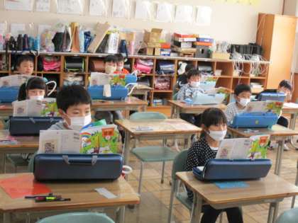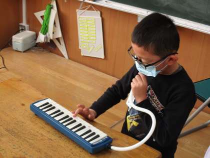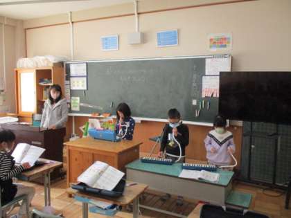 授業のめあては「ただしいゆびつかいでえんそうしよう」でした。「山のポルカ」という曲を、先生のオルガンに合わせ、一人ずつ演奏しました。指使いに注意し、とても上手に演奏していました。聞く態度もすばらしく、曲が終わるとみんな拍手でその頑張りを称えていました。