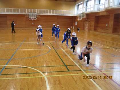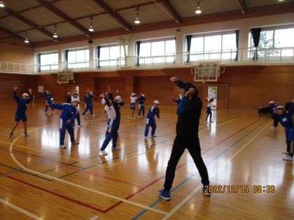 体育館の中は寒かったですが、子どもたちは元気よく準備運動をしました。