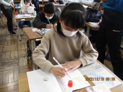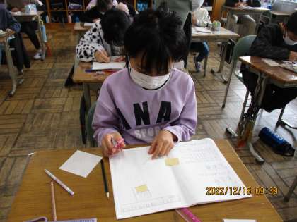 子どもたちは、配られたL字型の図形に線を引いて長方形に分けたり、線を付け加えて大きいな長方形にしたりして、答えを求めていました。