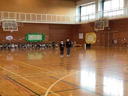 2年児童のかわいらしいはじめの言葉で6年生を送る会が始まりました。