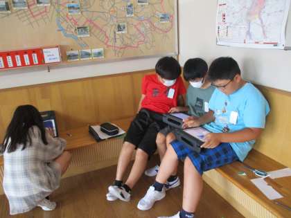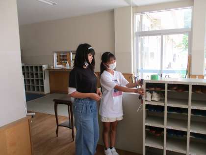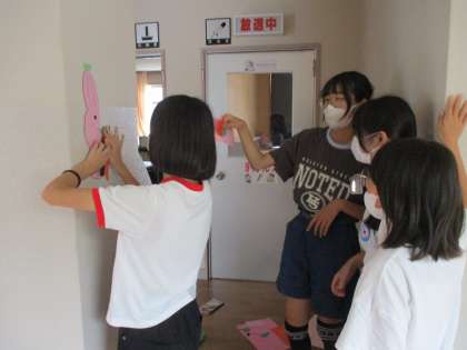 6年2組では、図画工作の時間に校舎に作った作品を間隔をあけて貼り、見る場所を決めて、ここから見ると作品が1つになって見える、ということを行っていました。