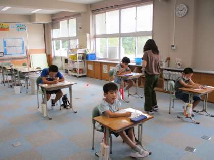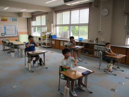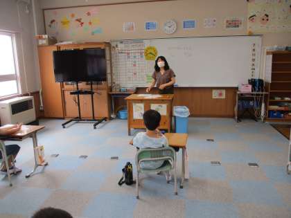 あおぞら学級では、子どもたちは、先生から夏休みについてのお話を聞いていました。