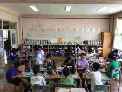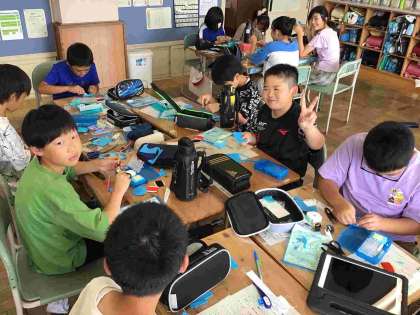 作ったコースターは給食の時間に、牛乳を置いて実際に使うことができました。