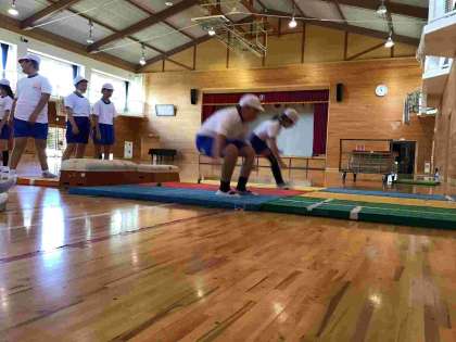 今日の3時間目の体育では、幅跳びの着地の練習を行いました。跳んだときの足の曲げ方や、着地するときの身体のポーズなどを確かめながら行いました。