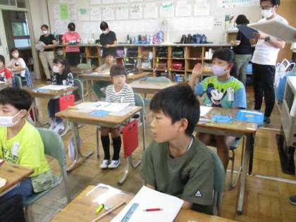 子どもたちは、先生が提示した図形を見て、2つのなかまに分ける活動へと移っていきました。