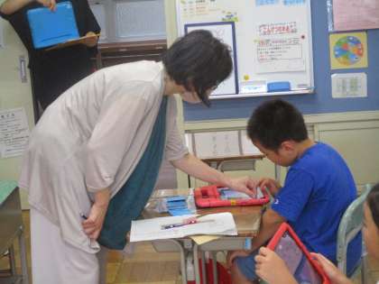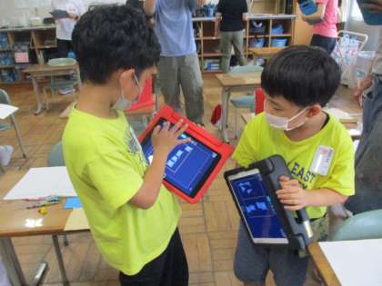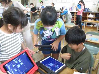 子どもたちそれぞれがなかま分けを終えました。その後にグループになって、タブレットの画面を見ながら、なかま分けをしたことの確認をしました。