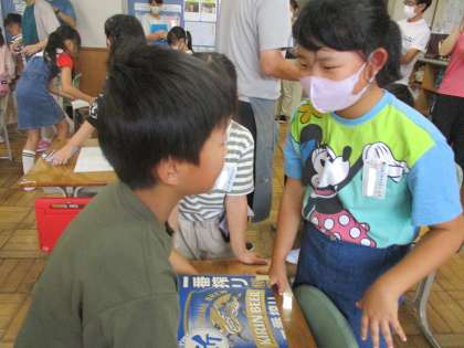 触れて当たれば3点ということで行わせました。子どもたちは、先生が用意したものを喜び、班で仲よくゲーム感覚で取りかかりました。