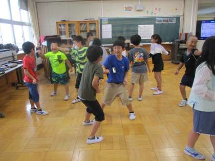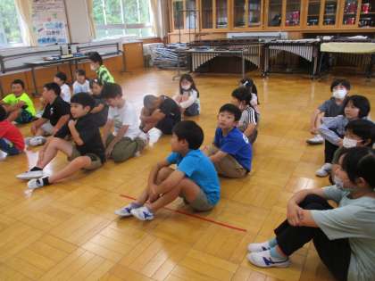 はじめに楽しい雰囲気で授業が始められるように先生のピアノにあわせて「くるくるじゃんけん」や「ドレミで歌おう」の活動をしました。
