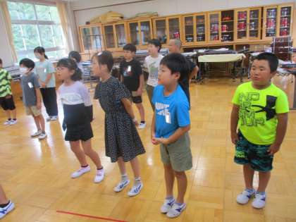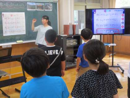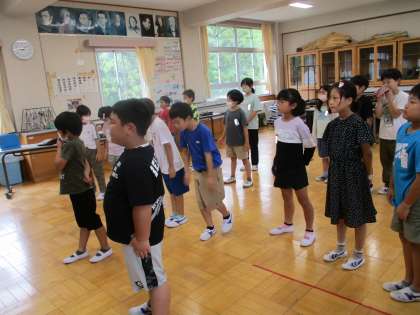 班で発表した後に、みんなで工夫するところや強弱をつけて「ふじ山」を歌いました。