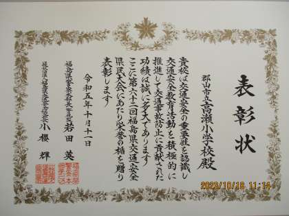 今年度、交通安全優良学校として表彰されたのは、県内のすべての保育園、幼稚園、小学校、中学校の中から10団体で、本校がその中の1団体に入り、大変栄誉ある賞を受賞して来ました。