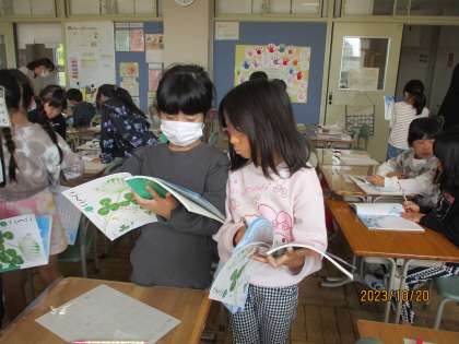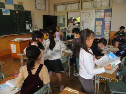 子どもたちは、教科書を読みながらくものクジラがしたことについて、友達と確認しながらしっかり学習を進めていました。