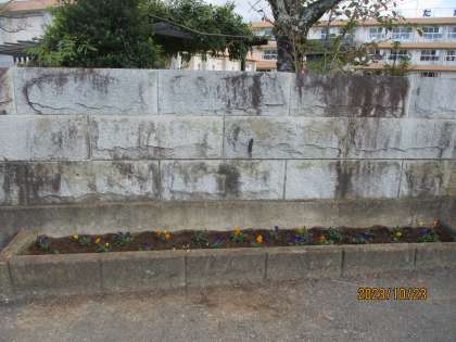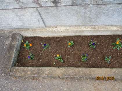 本日、学校に来てみると、校門の花壇のところと外トイレ前のところにパンジーとビオラが植えられていました。