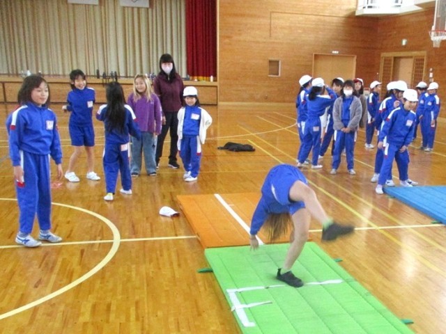 3年生は、体育でマット運動をしています。前転、後転等、いろいろな技に取り組んでい...