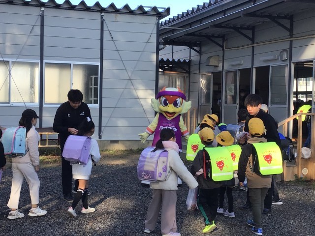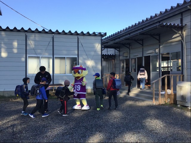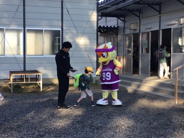 福島ファイヤーボンズのボンズくんが朝のあいさつ運動に来てくれました。