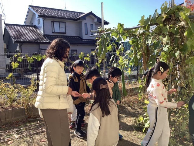教室で身近な虫の名前を学習した後、外に出て花壇に隠された虫のカード探しをしました。