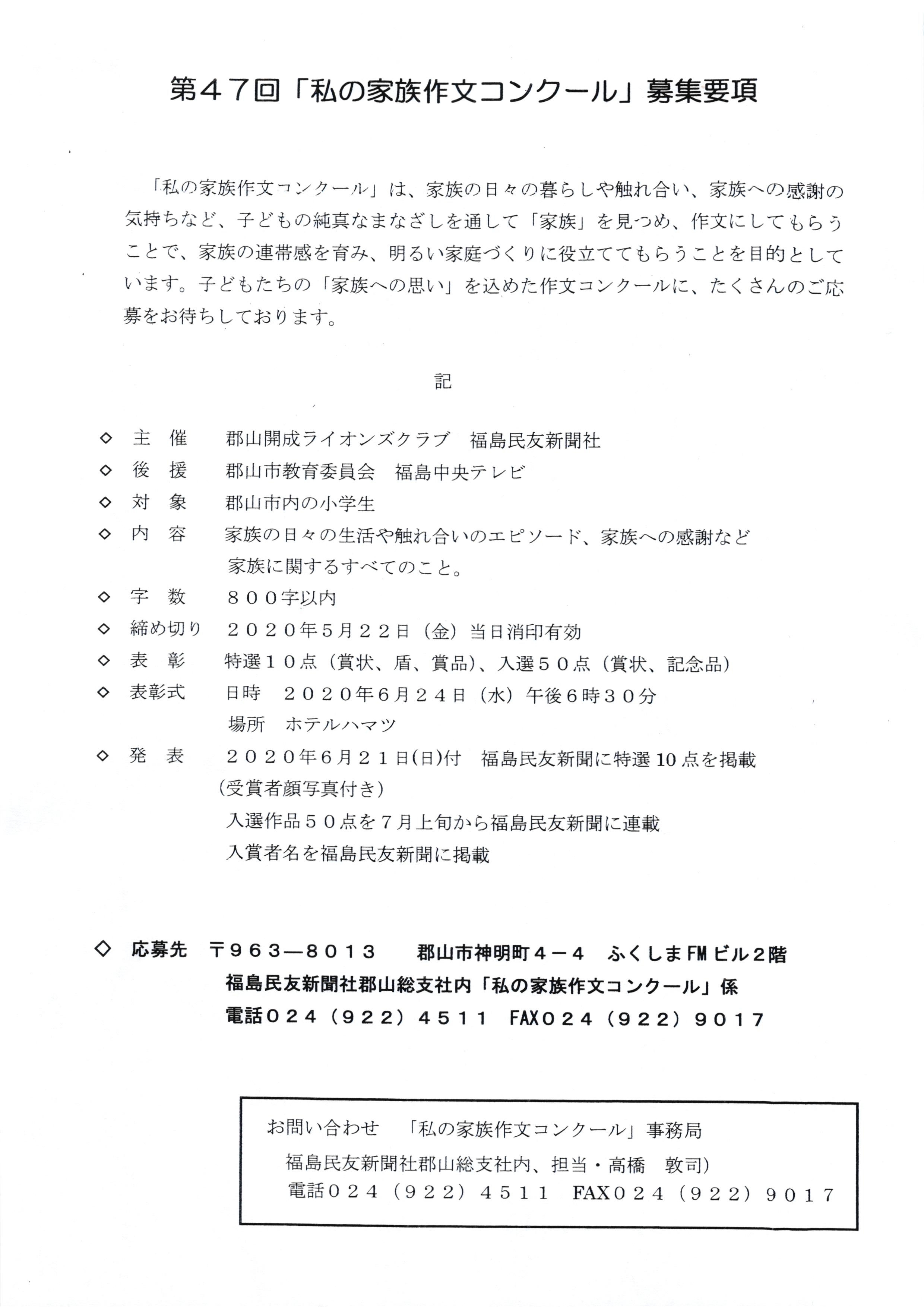第47回「私の家族作文コンクール」募集要項をアップしましたのでご活用ください.(必ず応募しなければならないものではありません。)