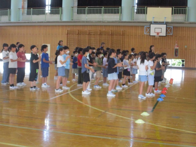 来週行われる陸上交歓会に向け、全校生で6年生へエールを。