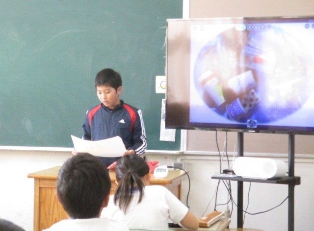 グラフや写真など、根拠となる資料をたくさん提示しながら、聞いている人にわかりやすく伝えています。