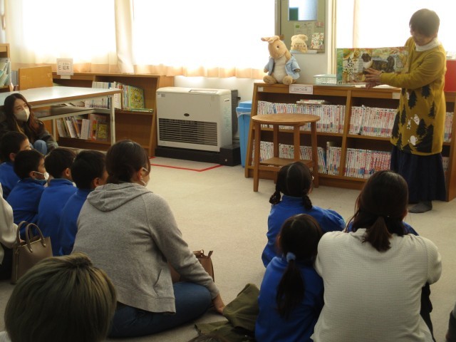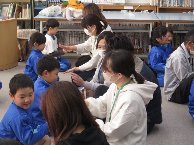 読書ボランティアの方が講師として来てくださり、読み聞かせや手遊びを体験しました。